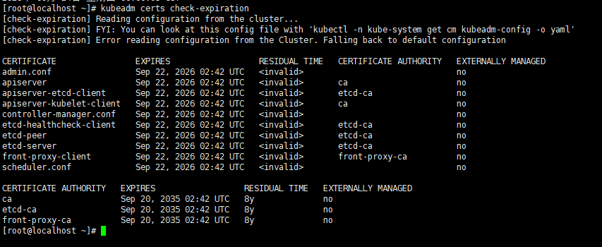RESIDUAL TIME=invalid并不是证书过期了,而是 kubeadm 在解析本地时间时认定“当前时间”晚于证书有效期,导致它直接给出 <invalid>。
