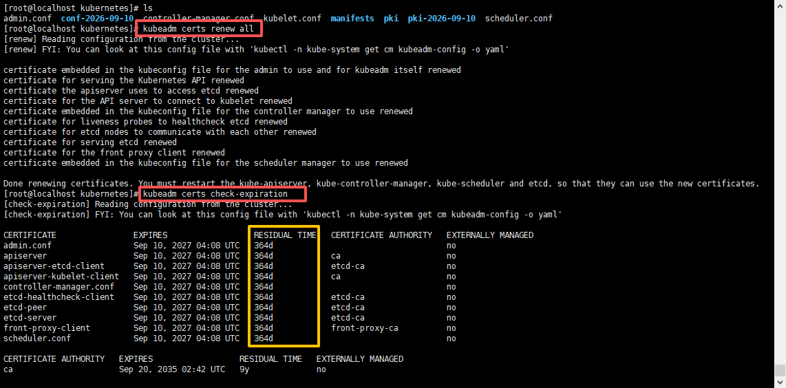 kubeadm certs check-expiration这里作为展示我就临时调整了一下日期,直接让他邻近过期时间就行;