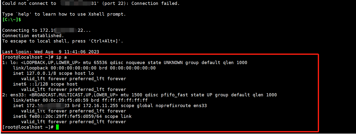 会发现桥接(bridge)列表中的 br0 桥接 ens33 已经没了,然后ip a查看ip时,ens33没有设置IP,所以,需要设置一下ip,然后重启服务,就可以连接上了;