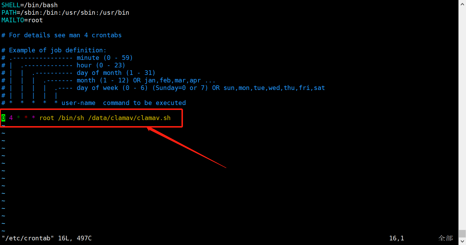 0 1 * * 7 root /bin/sh /home/clamav/clamav.sh