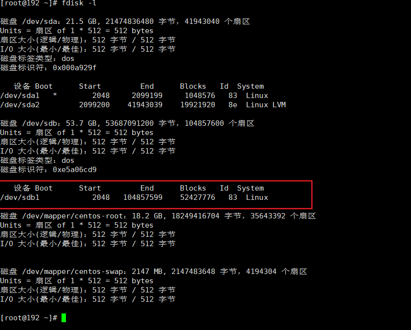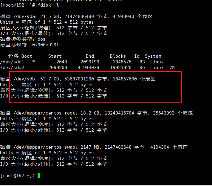 磁盘 /dev/sdb:53.7 GB, 53687091200 字节,104857600 个扇区