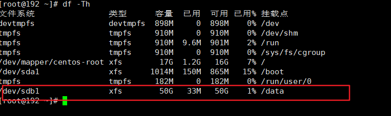 /dev/sdb1 xfs 50G 33M 50G 1% /data