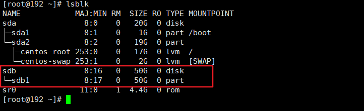 使用fdisk -l可以看到/dev/sdb下还有50G空间;目前是空闲的;我们需要将他这50G挂载到/data/上;