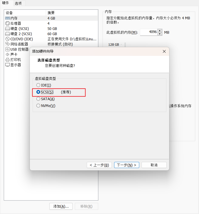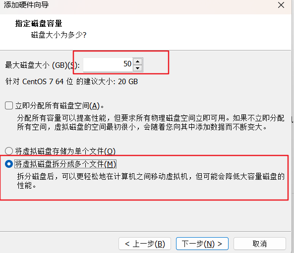 首先,我们需要准备一个虚拟机,并在添加一块硬盘;添加的时候使用推荐的即可,然后创建一个新的虚拟磁盘,这个就不会影响其他的了;磁盘大小我这里就设置成50G即可;过多的细节就不一一说了,一直下一步即可。