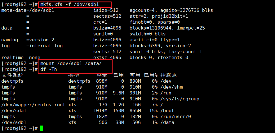 [root@192 ~]# mkfs.xfs -f /dev/sdb1