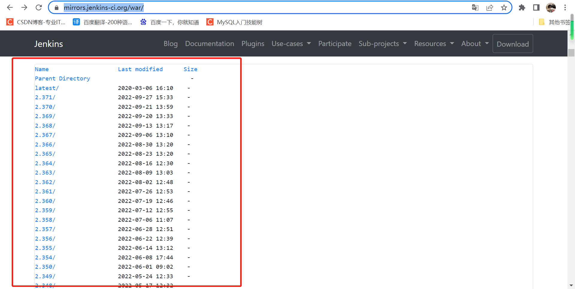 官网war包下载地址:https://mirrors.jenkins-ci.org/war/