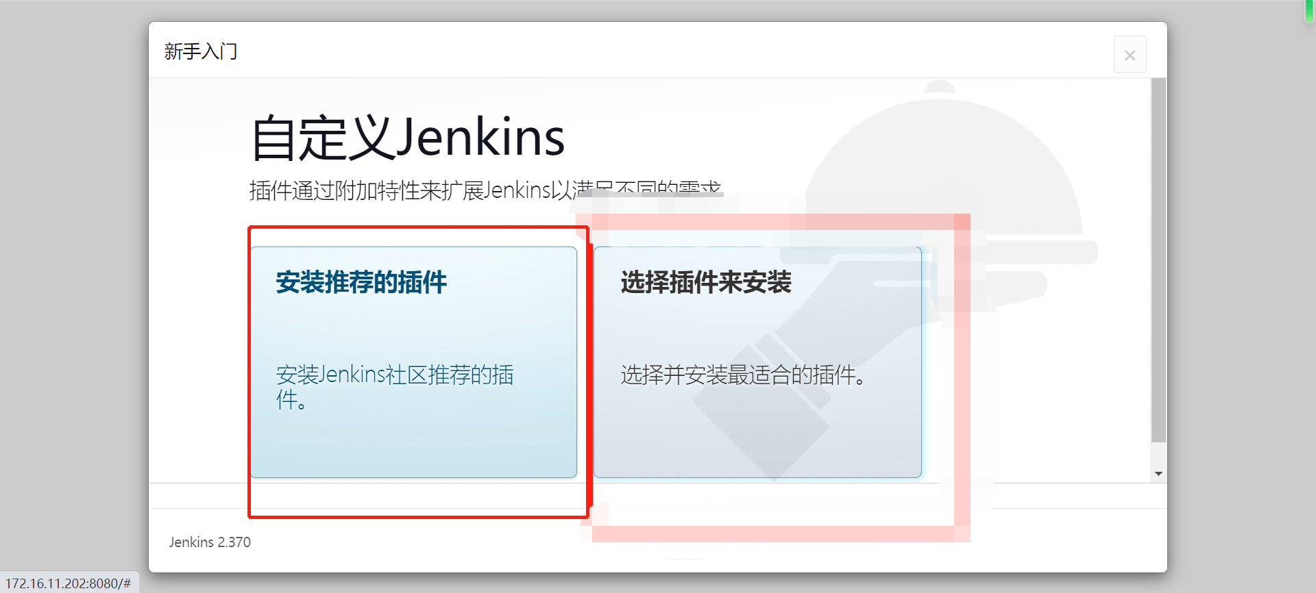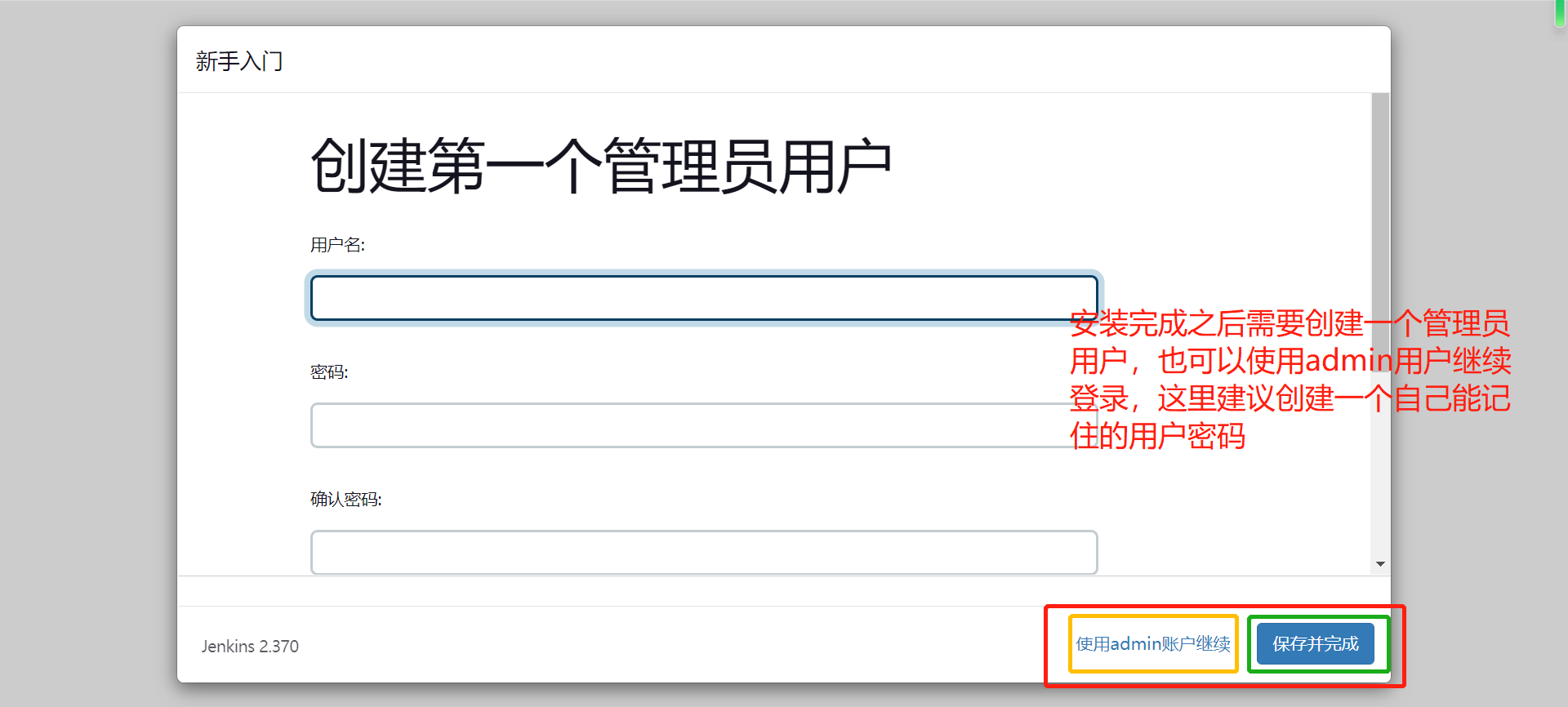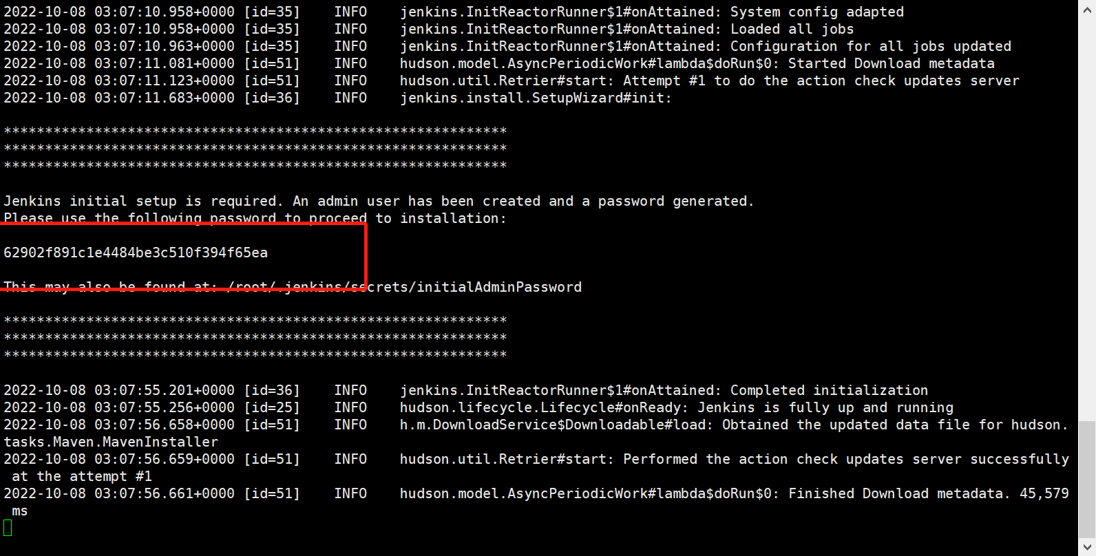 输入管理员密码:或者根据提示cat /root/.jenkins/secrets/initialAdminPassword 在这里面查看。