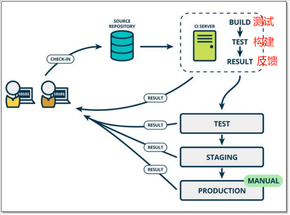 - 是一个自动化的、周期性的集成测试过程,从等都是,无需人工干预;