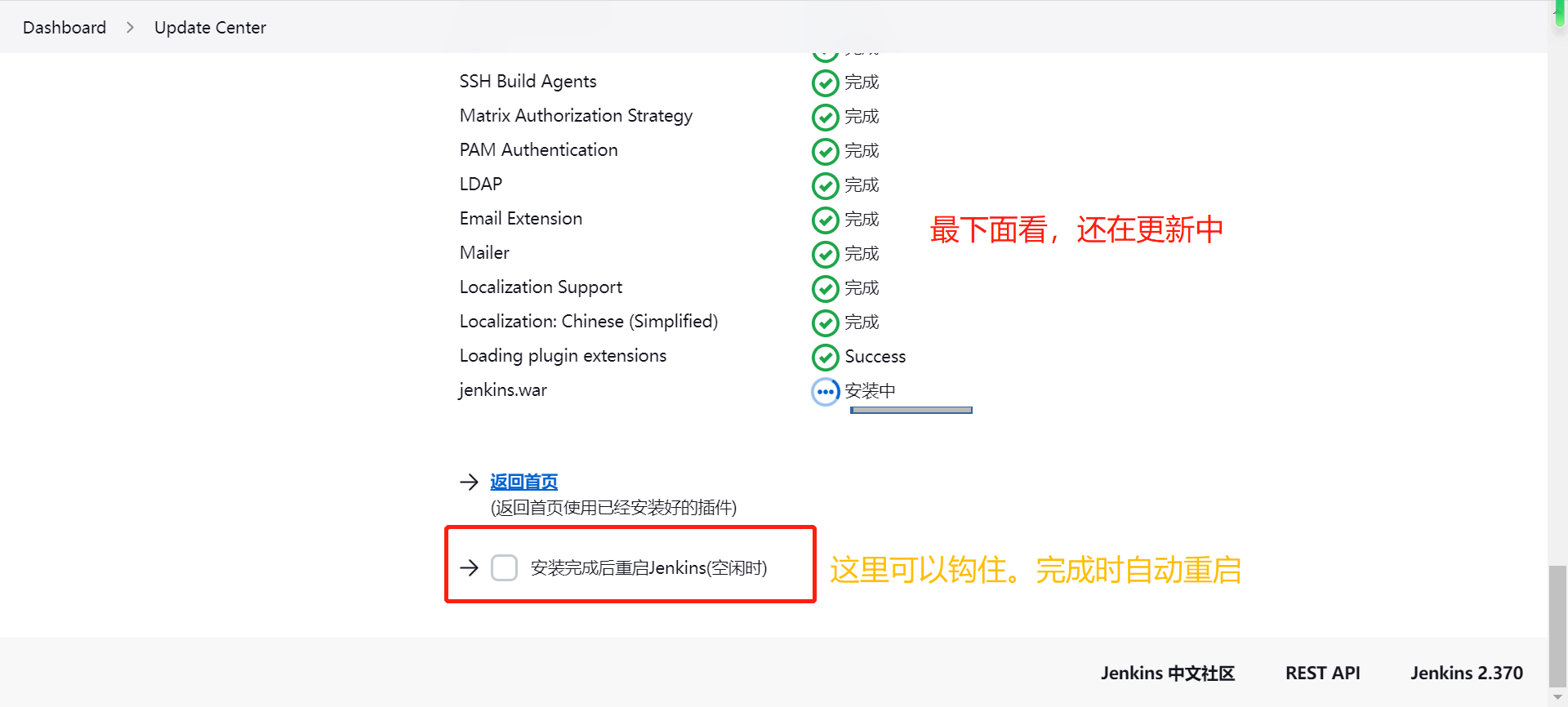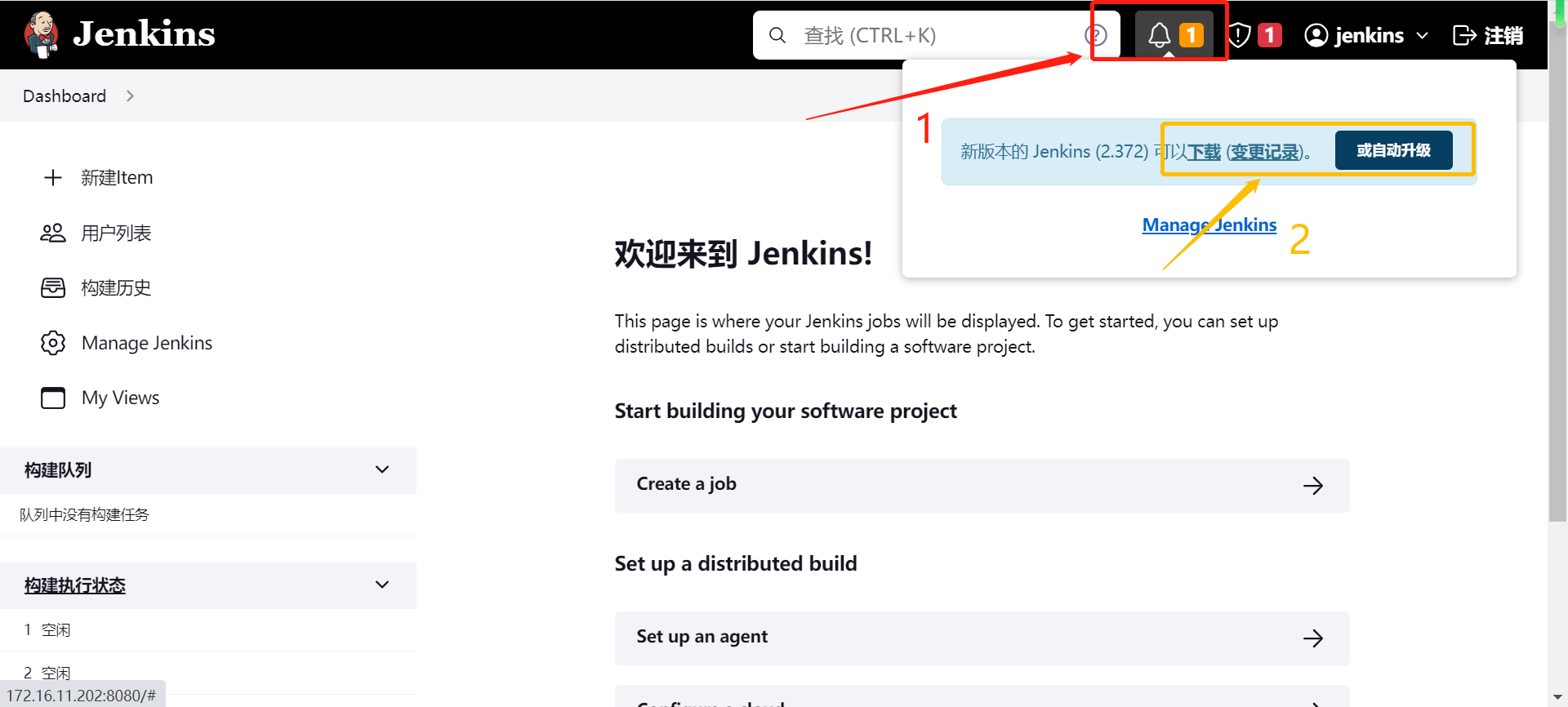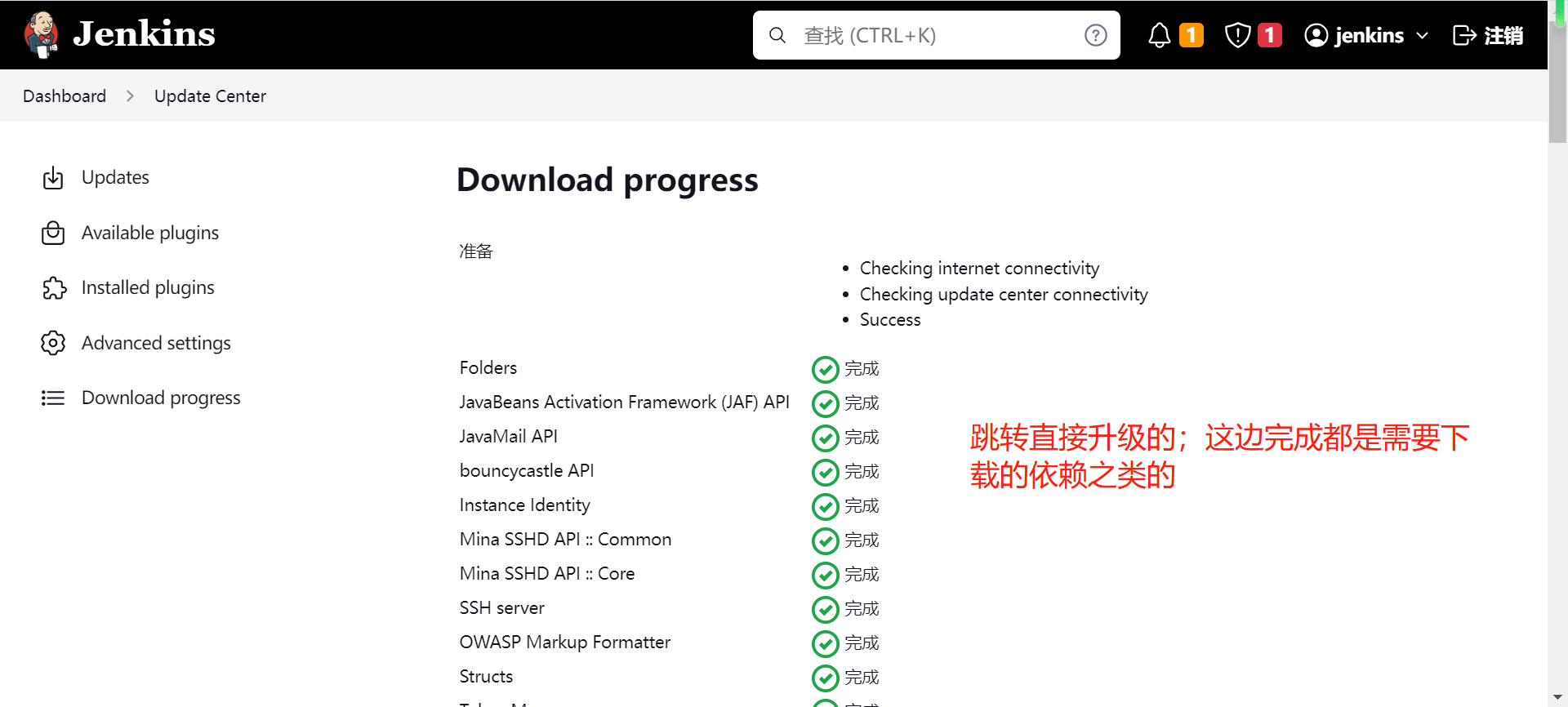 jenkins可以在官网下载最新的war包,也可以使用百度网盘的war包,用哪个都可以,用这个安装成功有个提示会问你要不要更新最新版本,像更新到时候更新就好了;