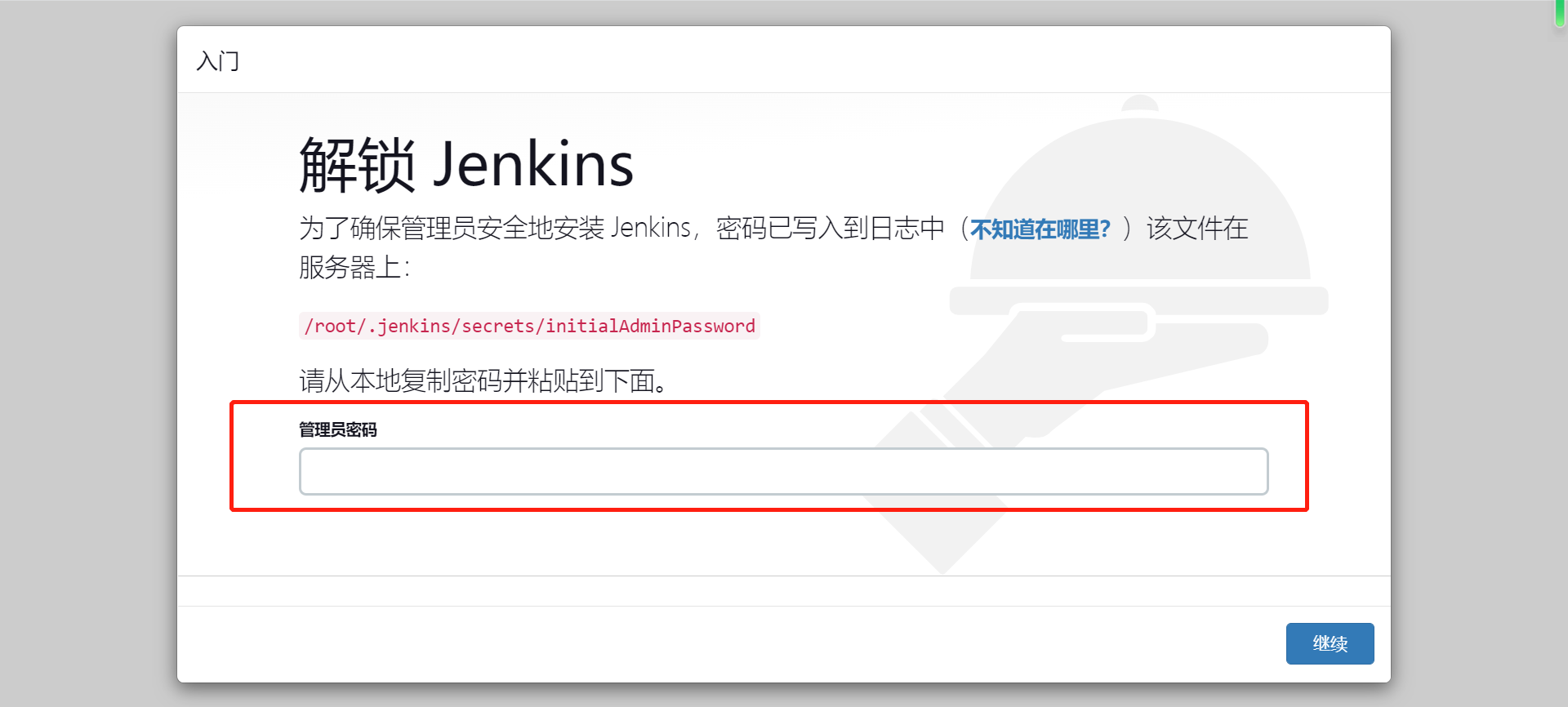 输入管理员密码:管理员密码在启动Jenkins的时候可以看到;