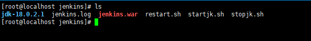 fi这样Jenkins目录下就有了5个文件:一个jdk18、一个Jenkins的war包、一个重启脚本、一个启动脚本、一个停止脚本。