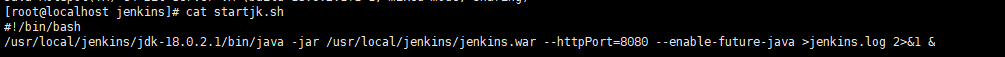 /usr/local/jenkins/jdk-18.0.2.1/bin/java -jar /usr/local/jenkins/jenkins.war --httpPort=8080 --enable-future-java >jenkins.log 2>&1 &