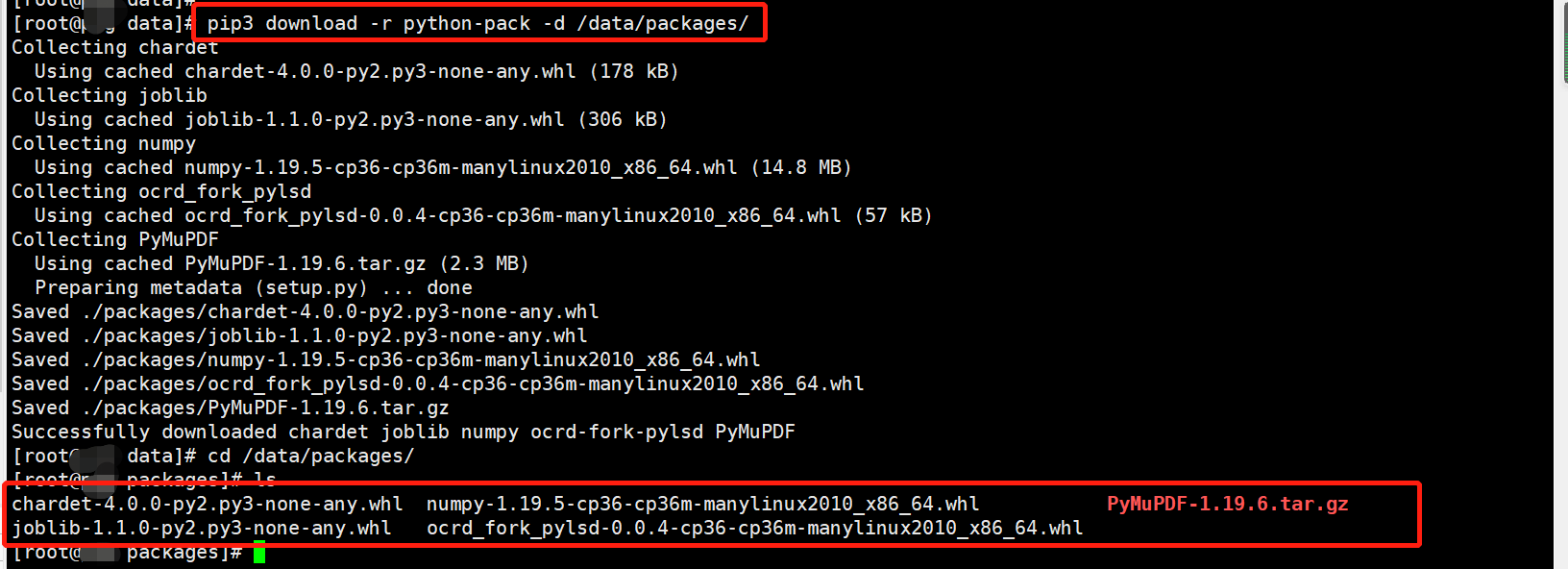 pip3 download -r 批量下载模块的文件名 -d 指定下载的路径pip3 download -r python-pack -d /data/packages/第一次下载和我这个图片可能有一些不一样,因为我这是测试的时候已经下载过了,删除又重新下载的(会有缓存),所以,与第一次下载过程是有一些差别的,不过,没有任何影响。