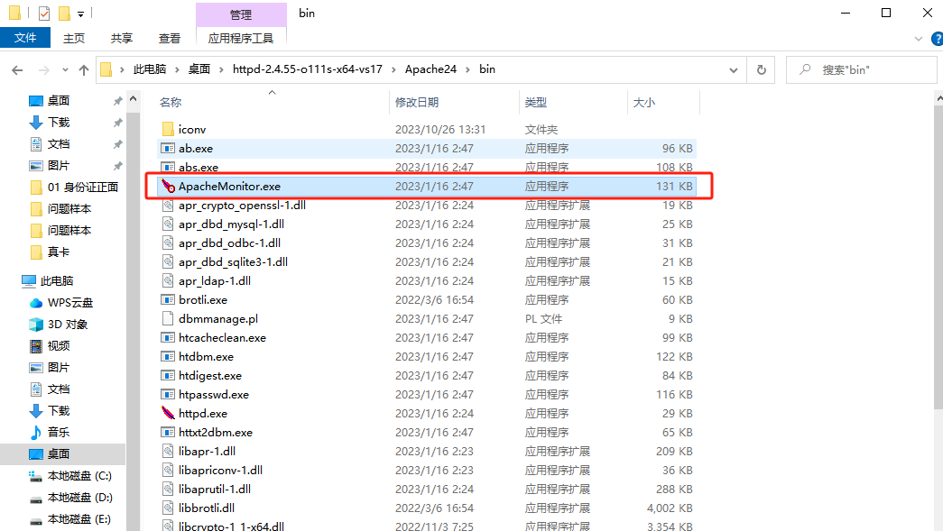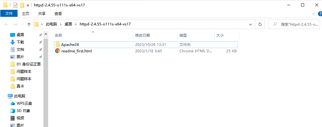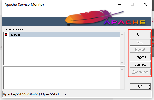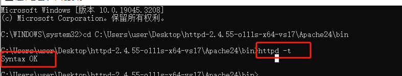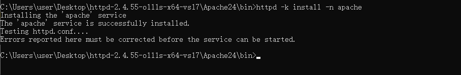 C:\Users\user\Desktop\httpd-2.4.55-o111s-x64-vs17\Apache24\bin>httpd -k install -n apache该命令的意思是,安装Windows可托管的Apache服务,其中 “-n” 后面参数是自定义Windows服务名称,之后可使用Windows管理服务的命令来管理apache服务,如