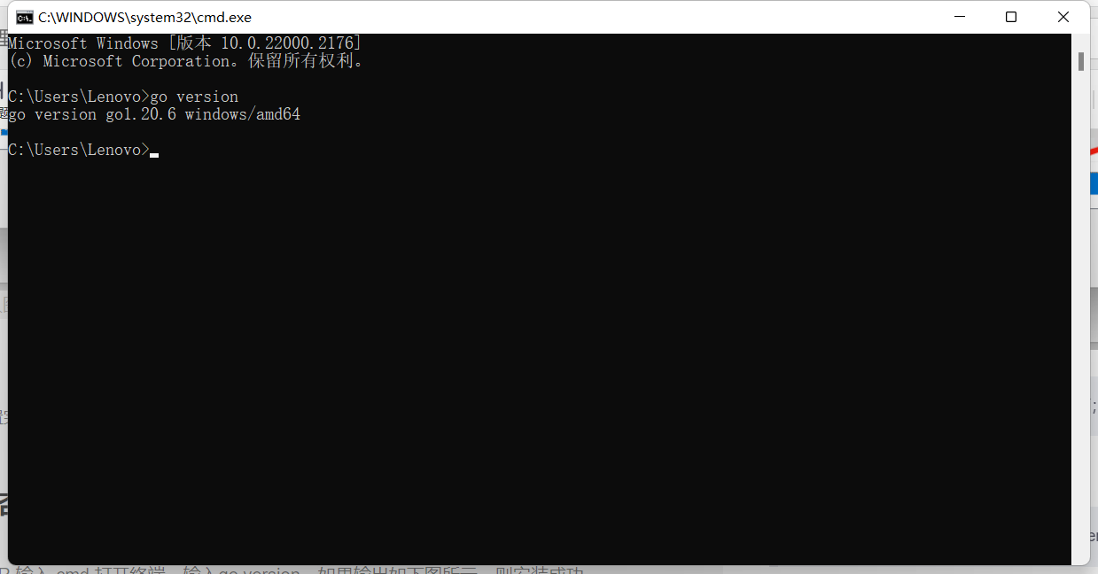 windows+R 输入 cmd 打开终端,输入go version,如果输出如下图所示,则安装成功。