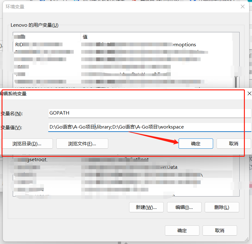 示例:D:\路径\go\library;D:\路径\go\workspace