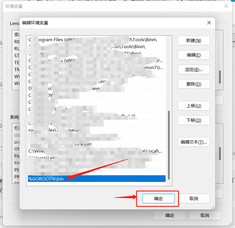 然后将新建的GOROOT配置到 Path 这个环境变量中去,在系统变量中找到 Path,点击编辑->新建,输入%GOROOT%\bin,点击确定。并将所有母窗口的确定全部点下,确保环境变量生效。
