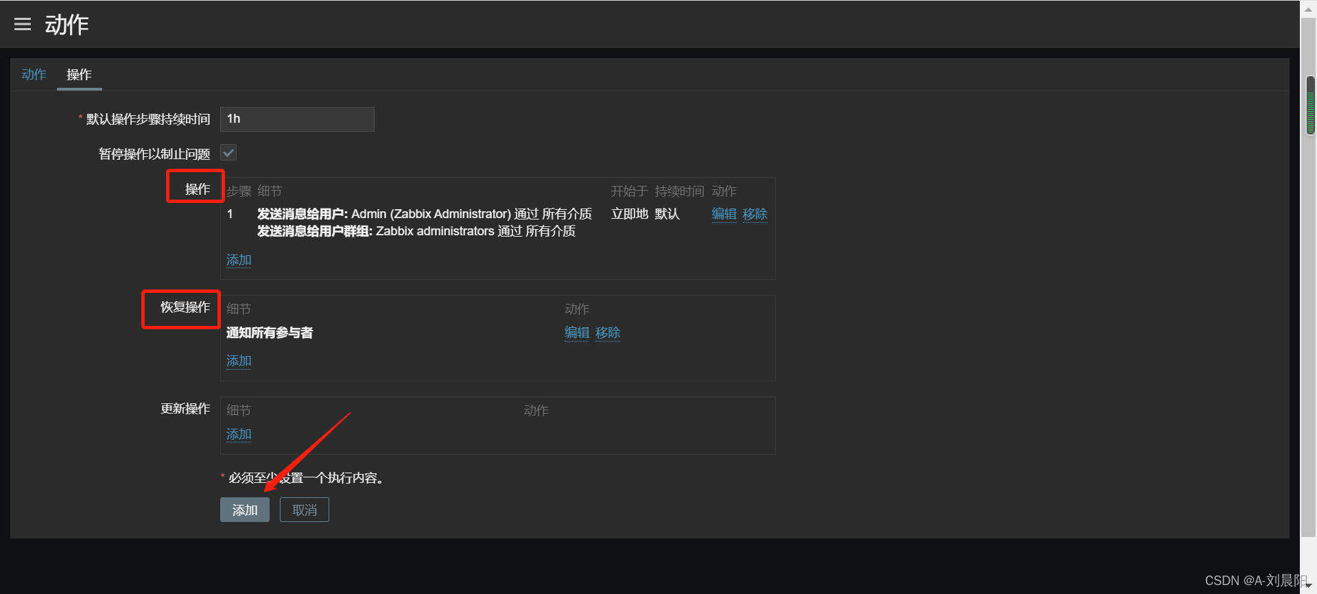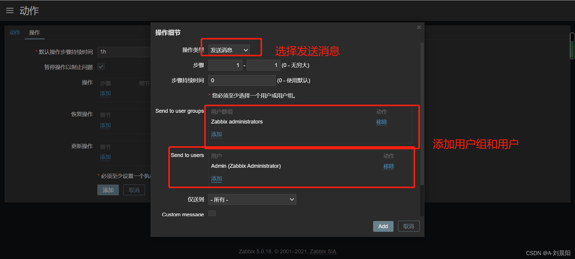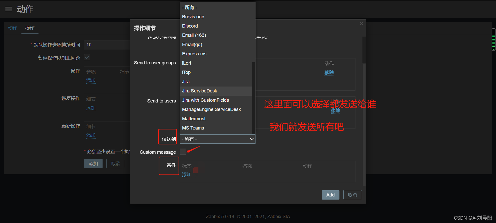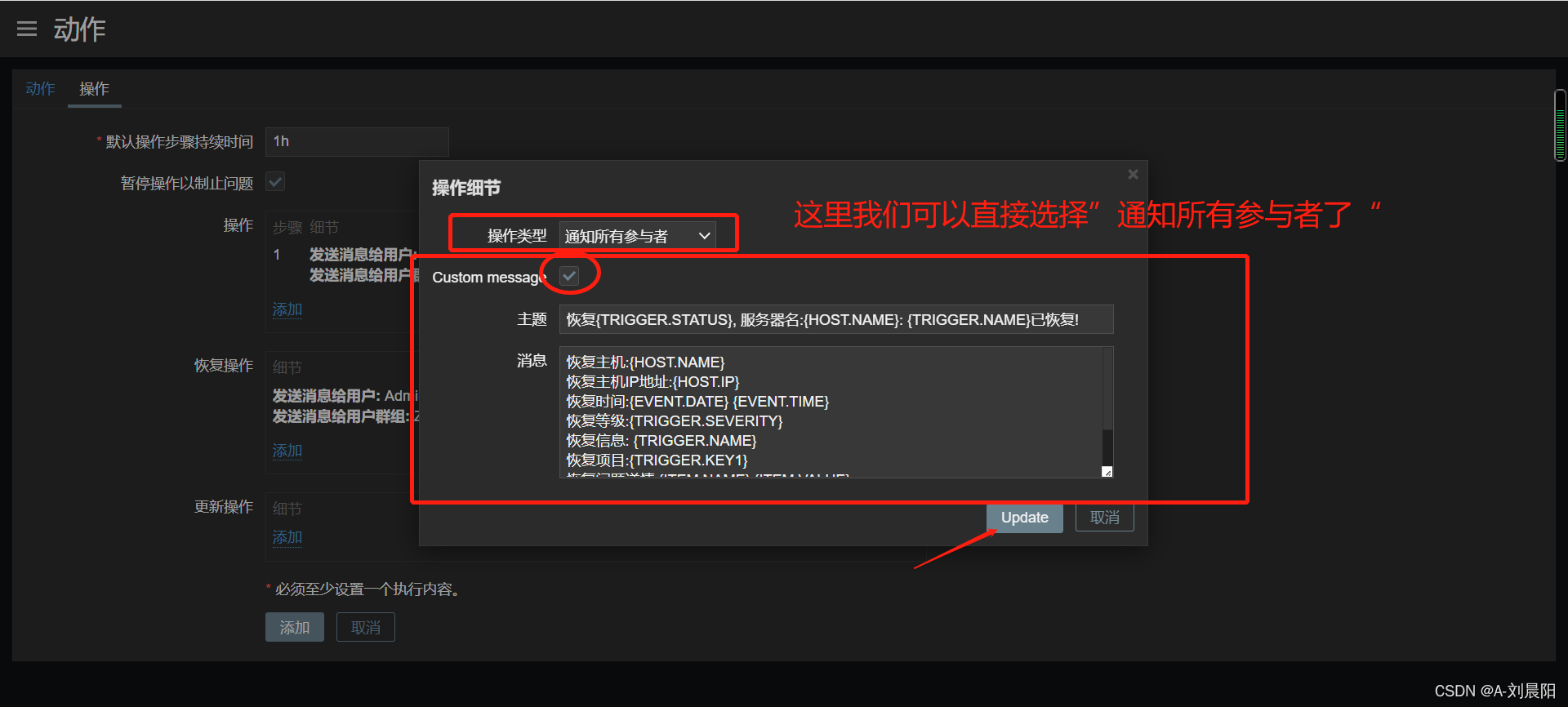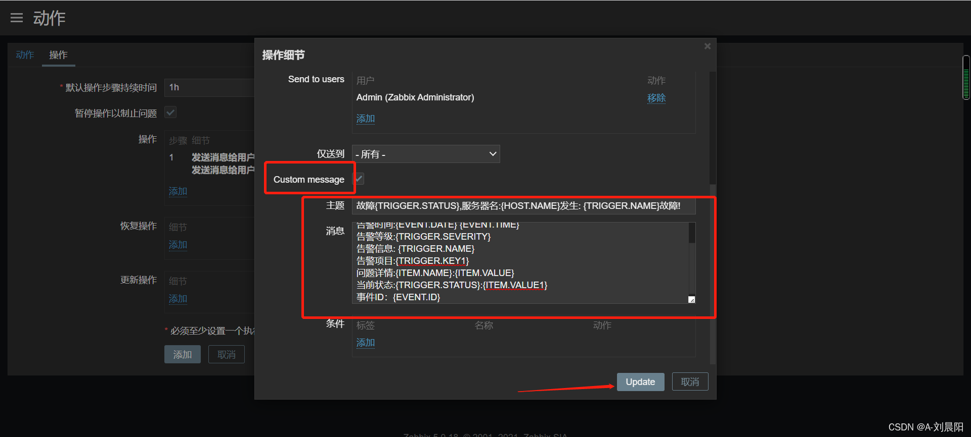 我们来勾选Custom message,告警和恢复的主题和消息,我们放到了这两张图的下面。