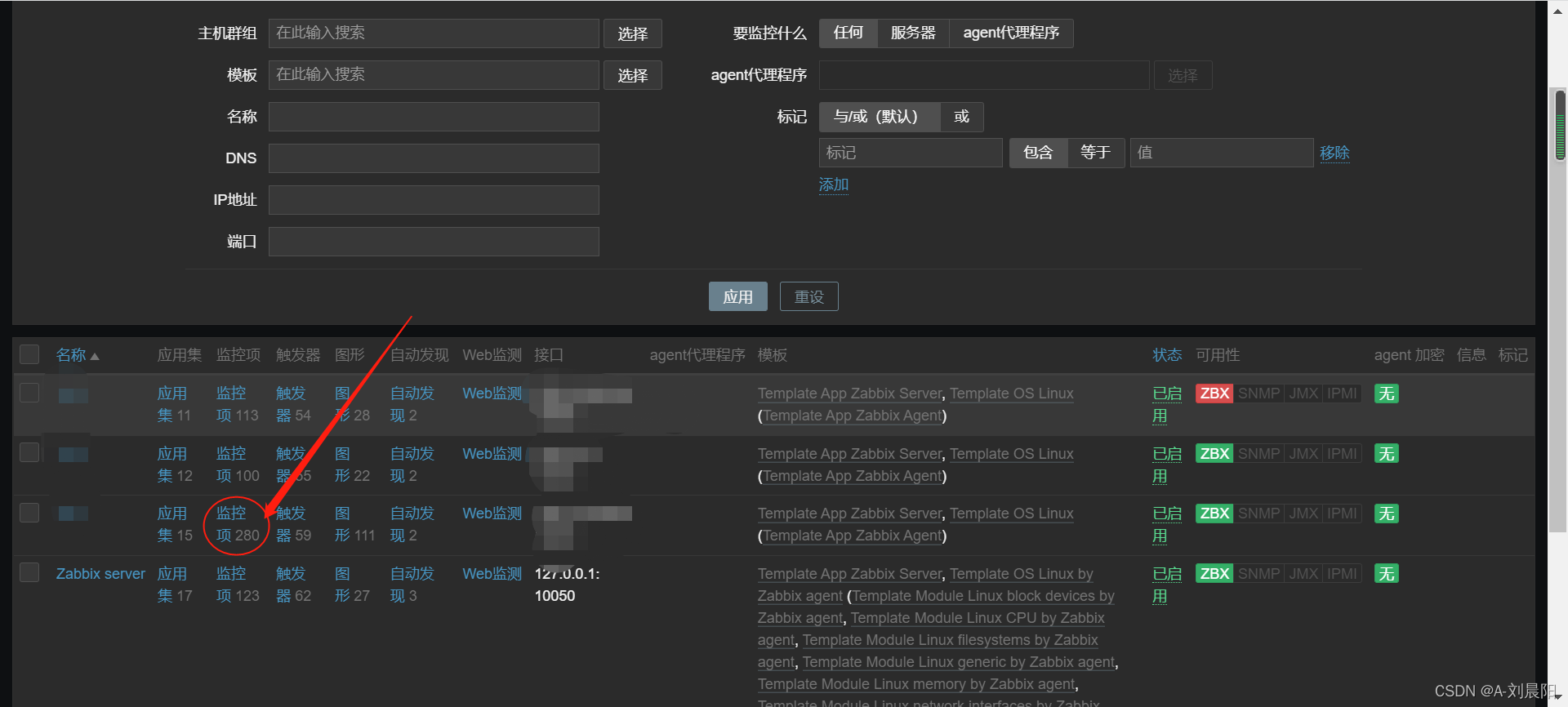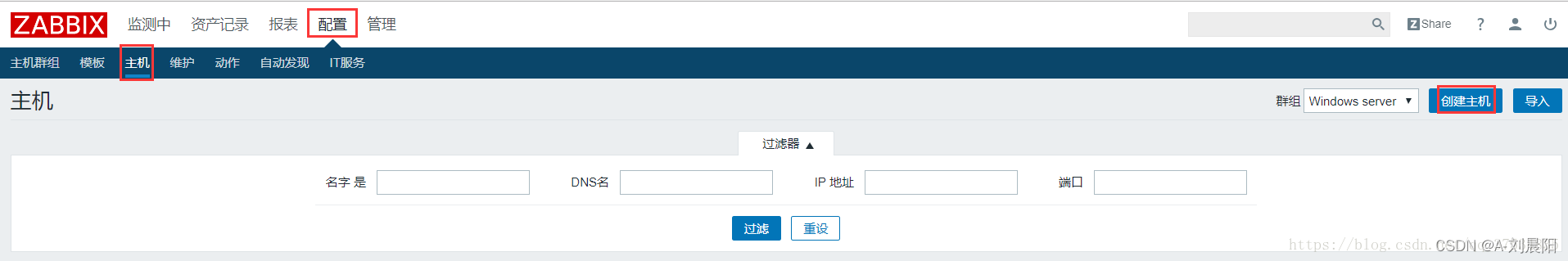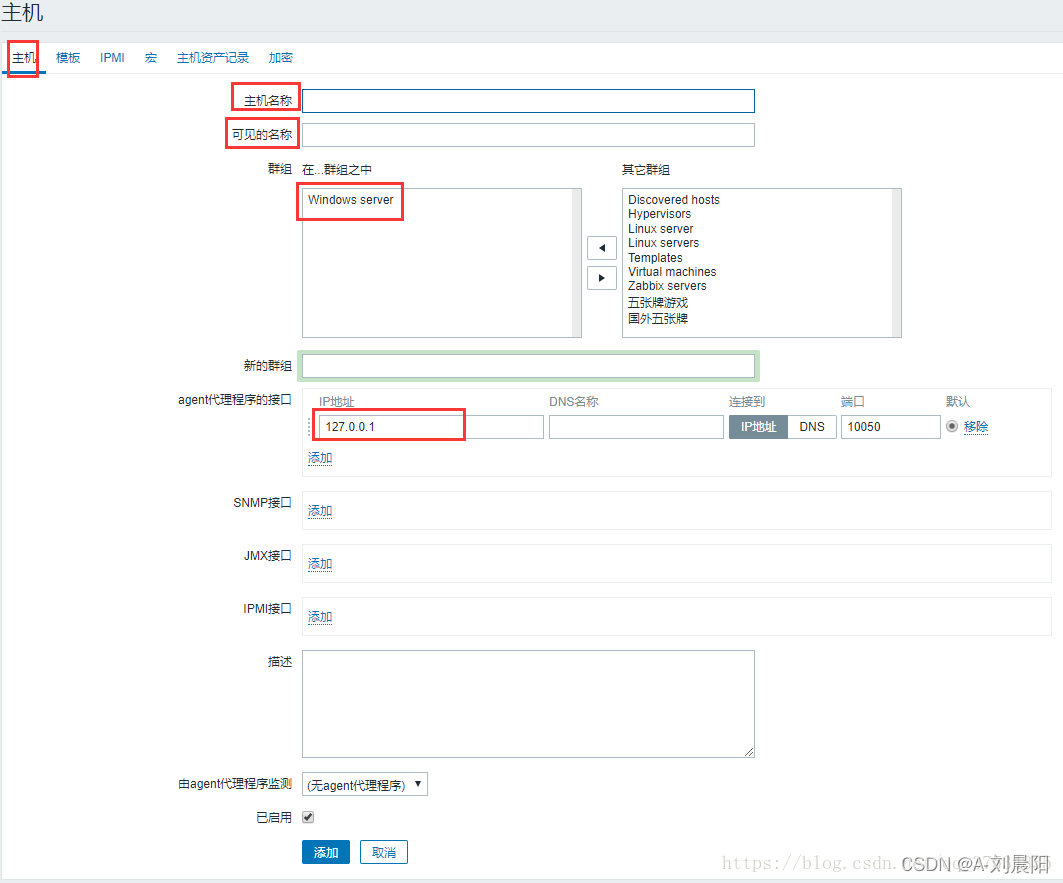 选择主机,并填写以下红框部分。与agent配置文件中Hostname保持一致,自定义,选择一个或者新建一个,一般为内网ip,如果需要走公网监控则填写公网ip