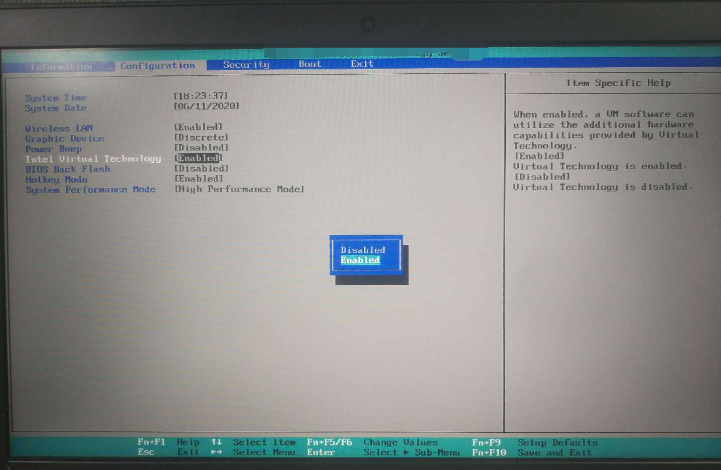 “configuration”,找到“intel virtual technology”,按回车,将“Disable(关闭)” 改为“Enable(打开)”