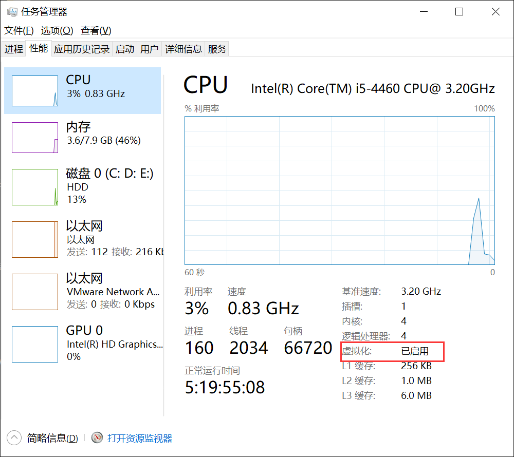 “性能” ——> “CPU”,可以看到虚拟化已经处于启动状态了。